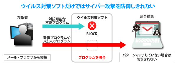 近年では毎日、新たなウイルスが数万種作られており、もはやウイルス対策ソフトやファイアーウォールだけでは、未知のウイルスやサイバー攻撃に対応することが出来なくなっています。